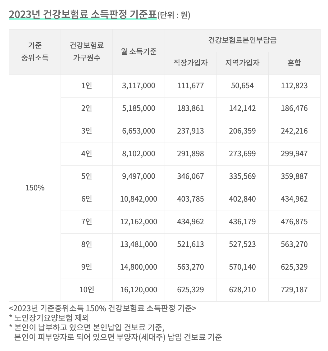 2023 건강보험료 소득판정 기준표 ㅣ 중위소득 150% 확인하기
