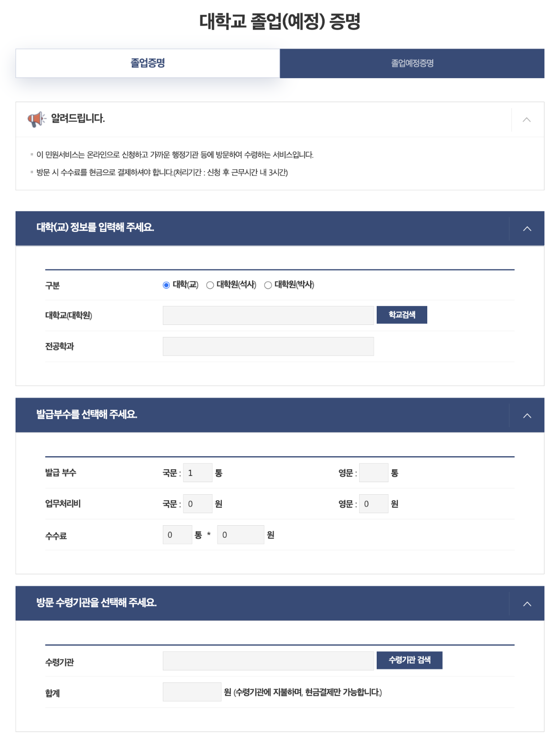 위의 졸업증명서 신청은 초, 중, 고등학교에 해당하는 증명서를 발급받으실 경우이고, 대학교 졸업증명서를 발급받으실 경우에는 다른 탭으로 이동하셔야 합니다. 대학교 졸업증명서의 경우에는 하단에 있는 수령기관을 선택하신 후, 수령기관에서 직접 수수료를 지불하고 발급받으셔야 합니다. 수수료는 1,000원이며 대리인 수령도 가능합니다. 대리인이 수령할 경우에는 대리인의 신분증과 위임장을 가지고 가시면 대리수령이 가능합니다.