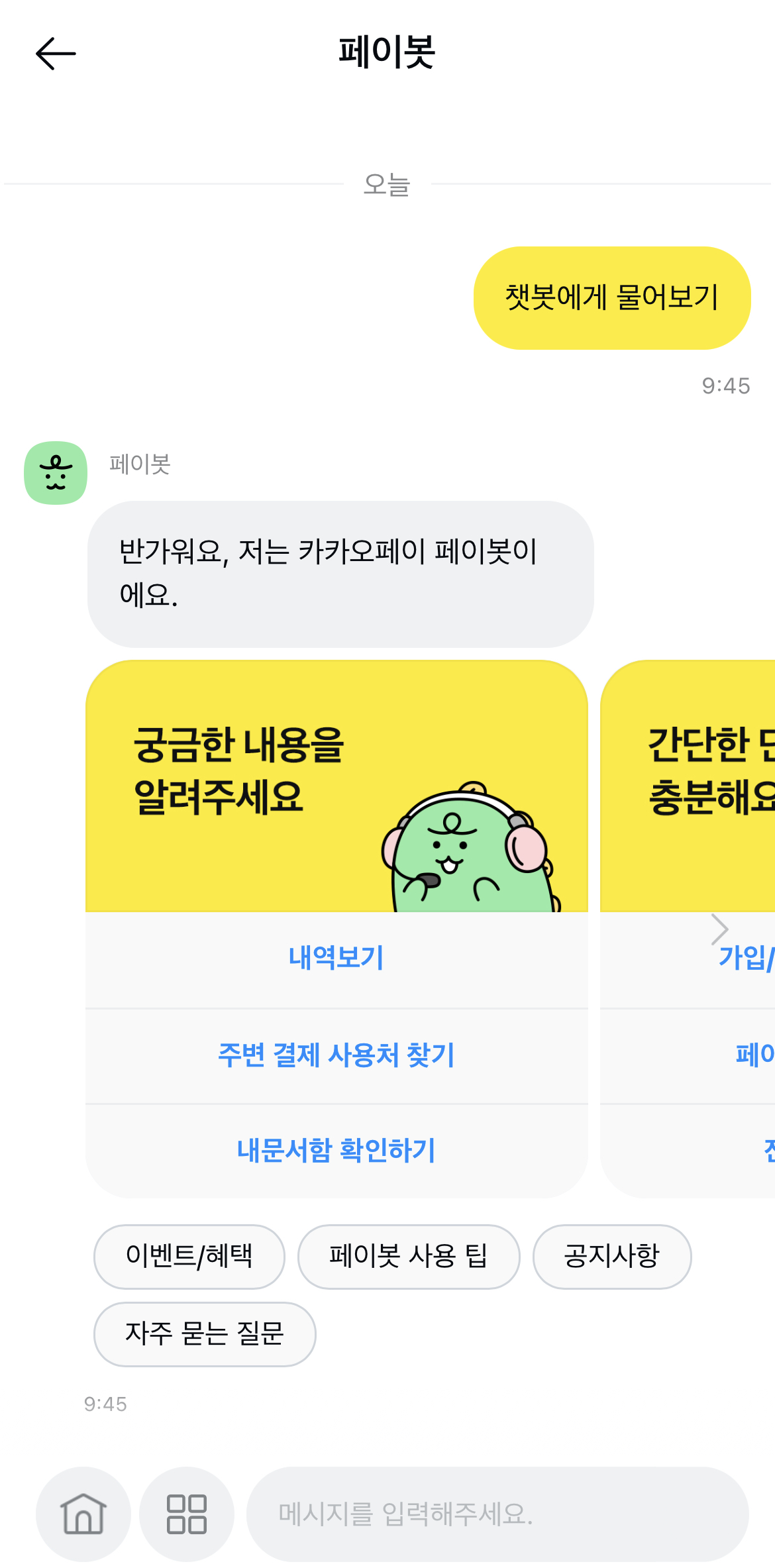 챗봇에게 물어보기를 누르시면 위와 같이 페이봇에게 궁금한 내용을 직접적으로 물어볼 수 있습니다. 만약 정형화된 문의가 아닌 개인적인 문의가 필요하신 분들이라면 [도움말 및 문의하기]를 클릭하시면 카톡 상담하기와 1:1 문의로 궁금하신 사항을 문의하실 수 있습니다.