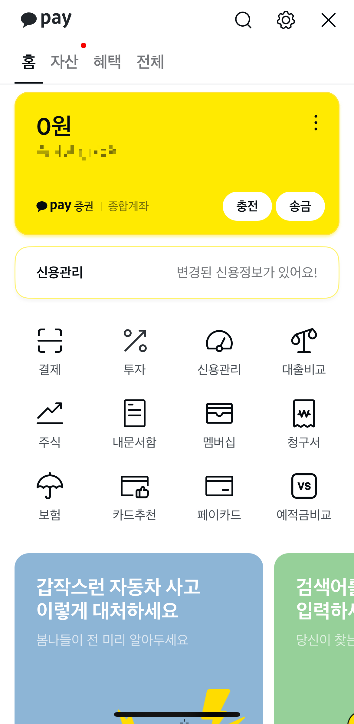 꼭 전화로 문의하지 않아도 카카오페이는 다양한 방법으로 문의를 할 수 있습니다. 카카오페이는 따로 어플을 설치하지 않아도 카카오톡 어플을 통해 이용할 수 있습니다. 카카오톡 하단의 맨 오른쪽 끝 아이콘을 누르시면 다음과 같은 화면이 나오게 되는데, 여기서 송금 / 결제 / 자산 위의 카카오페이 아이콘을 눌러 카카오페이로 들어갑니다.