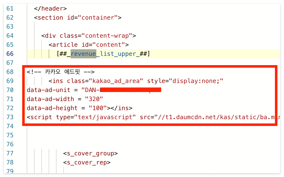 위에 보이는 것처럼 revenue를 검색하면 2개가 검색됩니다. revenue_list_upper라고 되어있는 부분 하단에 에드핏 광고를 붙여넣어주시면 됩니다. 저는 구분을 쉽게 하기 위해서 <!-- 카카오 에드핏 --> 이라는 문구를 넣어주었지만, 넣지 않고 코드만 넣어주어도 괜찮습니다.