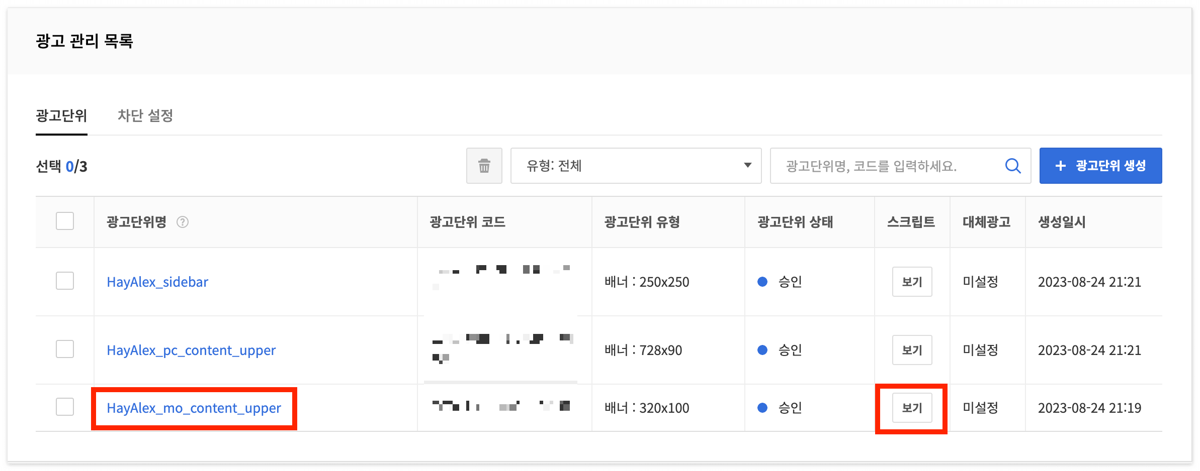 넣으실 코드는 카카오 에드핏 사이트에서 확인하실 수 있는데요. 카카오 에드핏에 접속하신 후, 광고관리목록에 들어가시면 광고단위가 나오게 됩니다. 저는 어차피 모바일로 유입되는 검색량이 많을 것 같아 [mo_content_upper] 의 광고단위를 사용하였습니다.