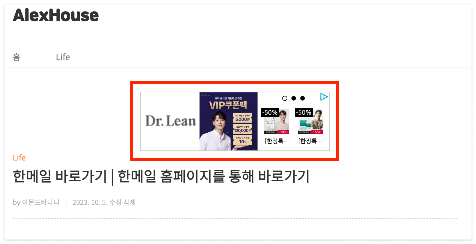 위의 방법으로 대부분의 광고를 설정할 수 있지만 아래와 같이 제목 상단에 광고를 올리는 작업은 HTML에서 수정해주어야 합니다.