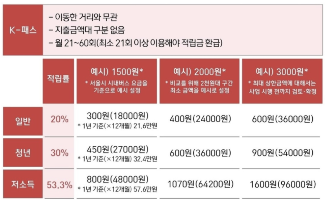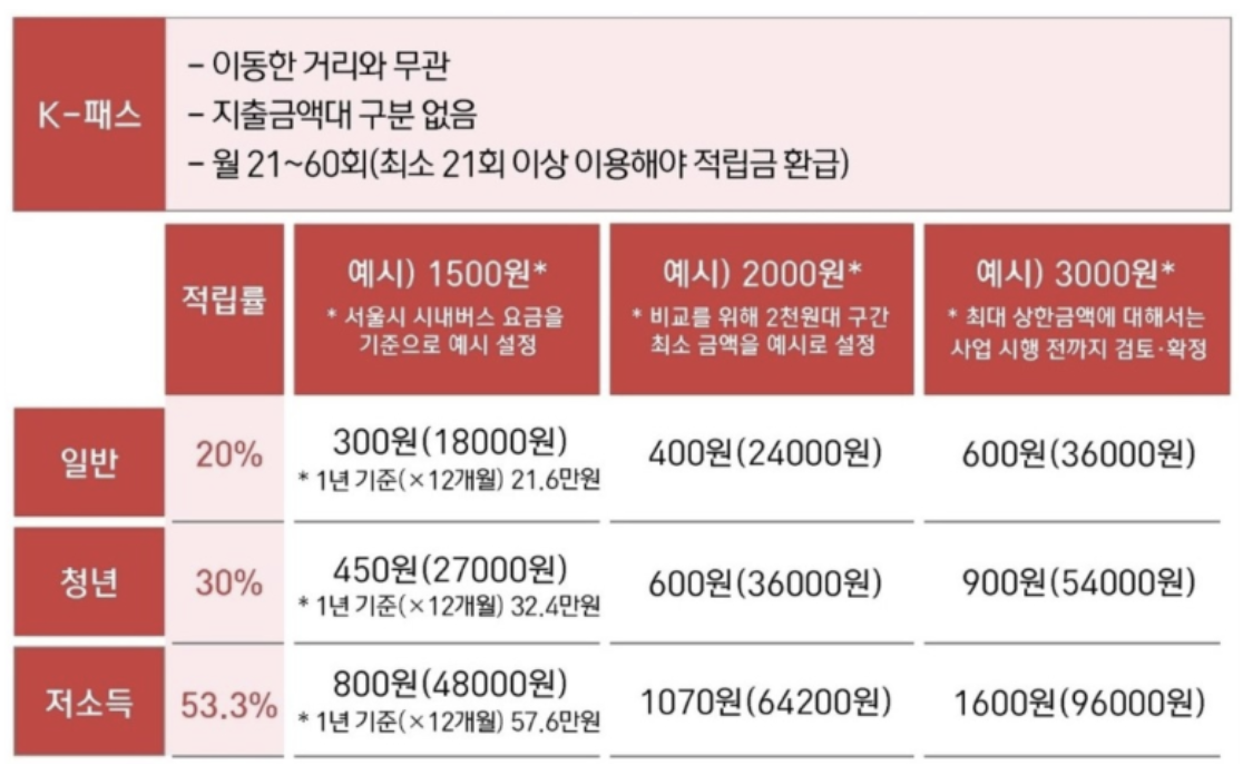 K패스는 전국 지하철과 버스를 월 15회 이상(최대 60회 한도) 이용하였을 경우, 일정 비율로 금액을 정립하고 정립된 금액을 환급해주는 대중교통비 지원제도입니다. 대상자에 따라 적립을 해주는 비율이 달라지는데, 저소득층의 경우 월 최대 48,000원까지 환급을 받을 수 있습니다.