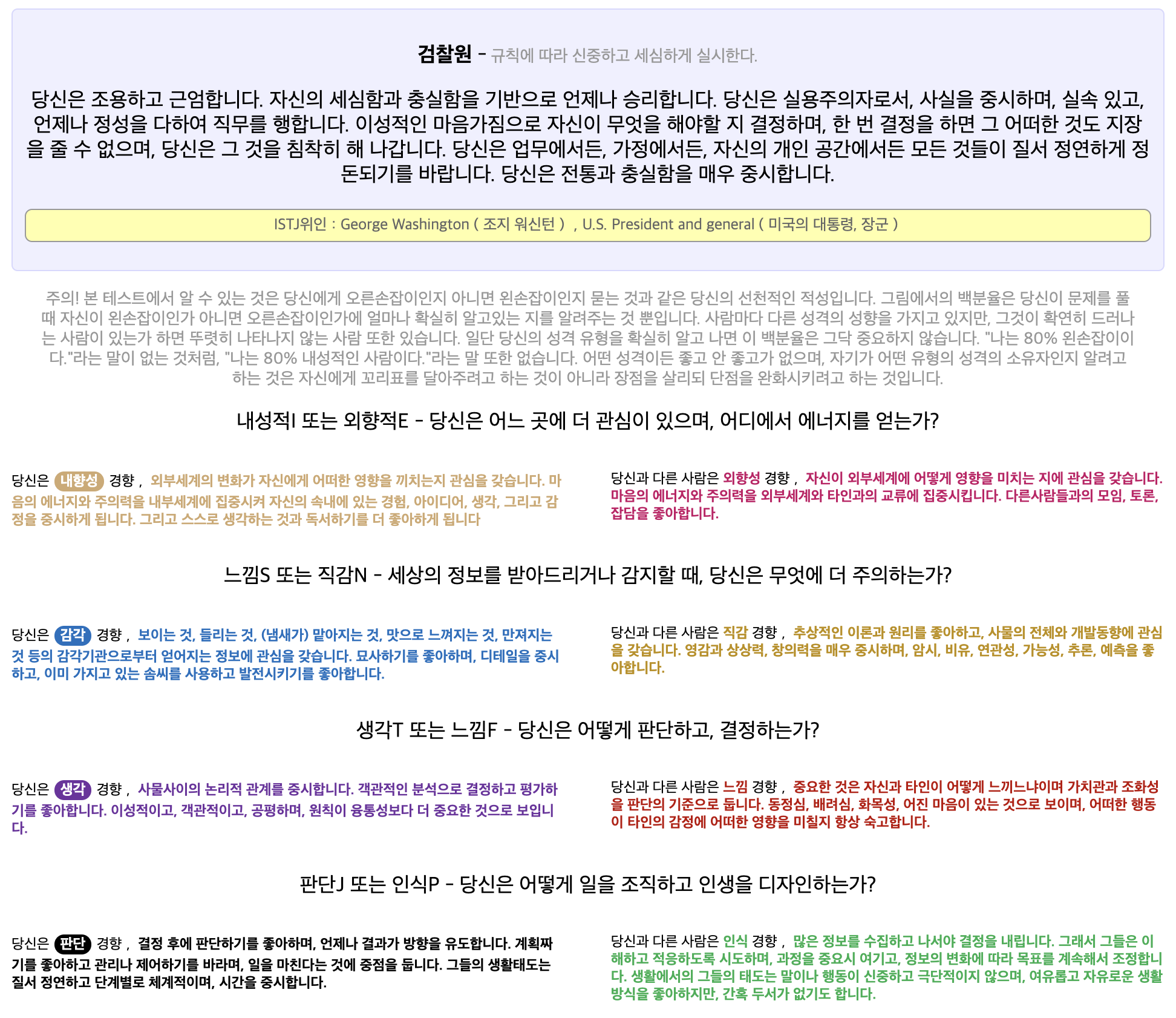 검사가 끝나고 난 후에는 자신의 직업성격유형이 도출됩니다. MBTI 결과와 함께 어떤 직업이 어울릴 것인지가 제시되고 자신의 성향에 대한 구체적인 판단이 제시됩니다. 100% 정확하다고 할 수는 없겠지만 혹시 자신의 MBTI가 무엇인지 잘 모르겠다고 생각하시는 분들이라면 재미 삼아 한번 해 보셔도 좋을 것 같습니다.