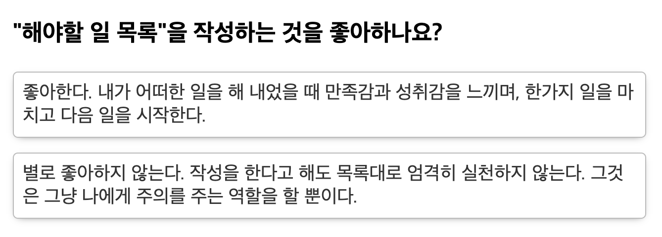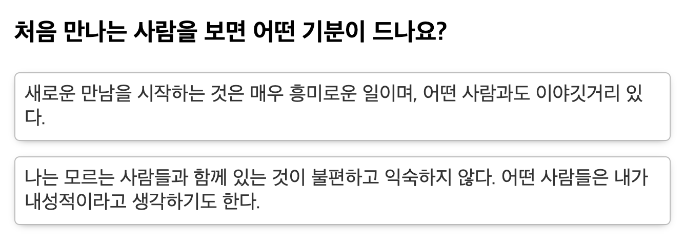 직업 적성검사는 여러개의 문항으로 이루어져 있습니다. 순서대로 자신에게 해당되는 항목을 골라나가다 보면 결과가 마지막에 도출됩니다. 질문의 예시는 아래와 같습니다. 검사 시간은 약 10분 정도 소요되며 떠오르는 대로 자연스럽게 대답하며 넘어가면 됩니다.