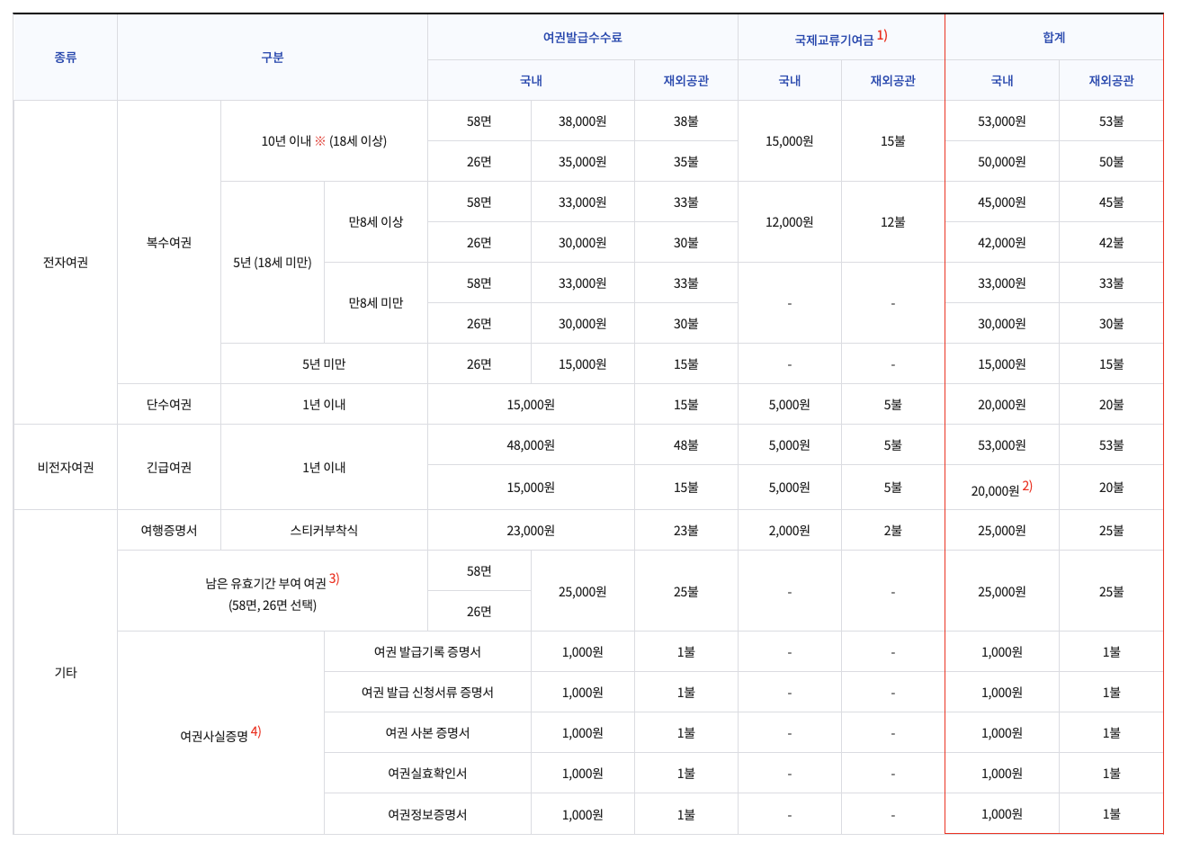 여권발급에 필요한 수수료는 아래와 같습니다.
